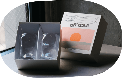 国内Topイラストレータにより、OFF COLAのためにデザインされたグラスと“pm6:00 / am2:00“のセット。